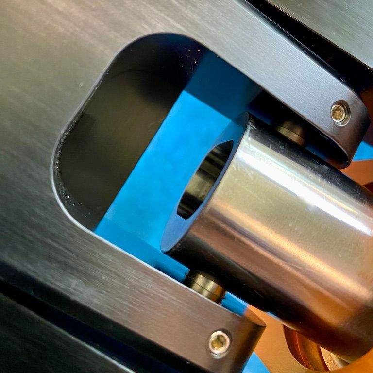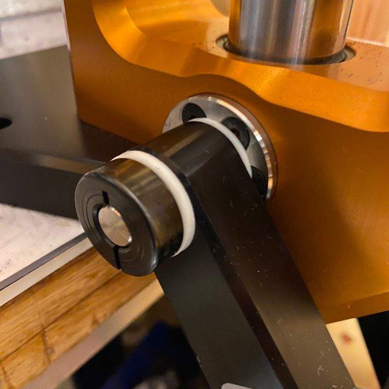 I perni in acciaio su cui ruotano i bracci del levaraggio di spinta sono rettificati H7 e spalleggiati con rasamenti in PTFE anti-usura da 2mm